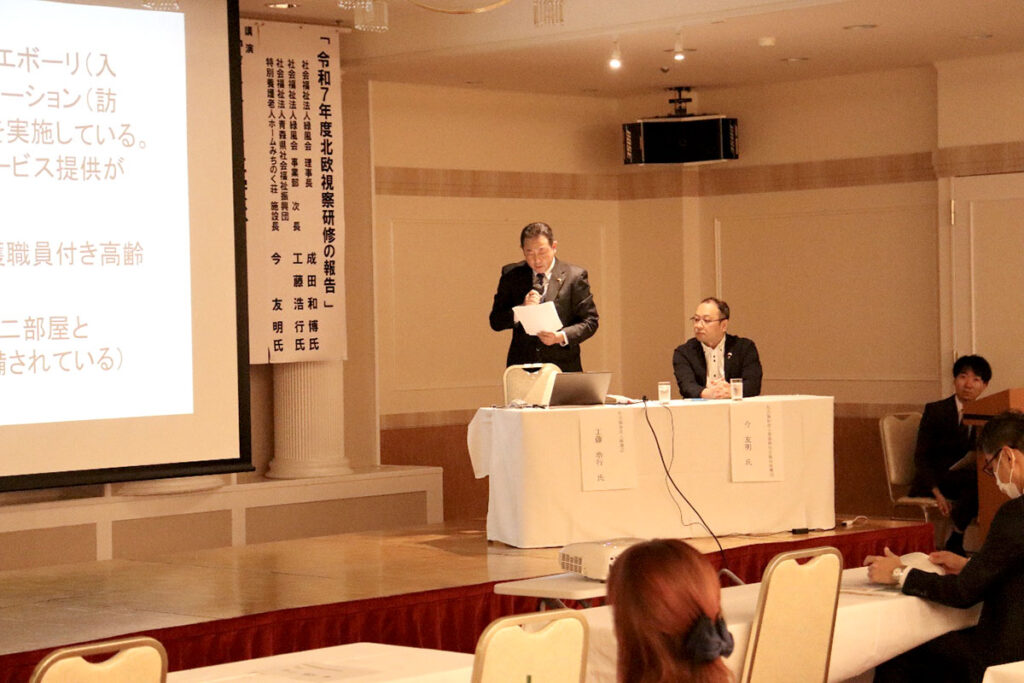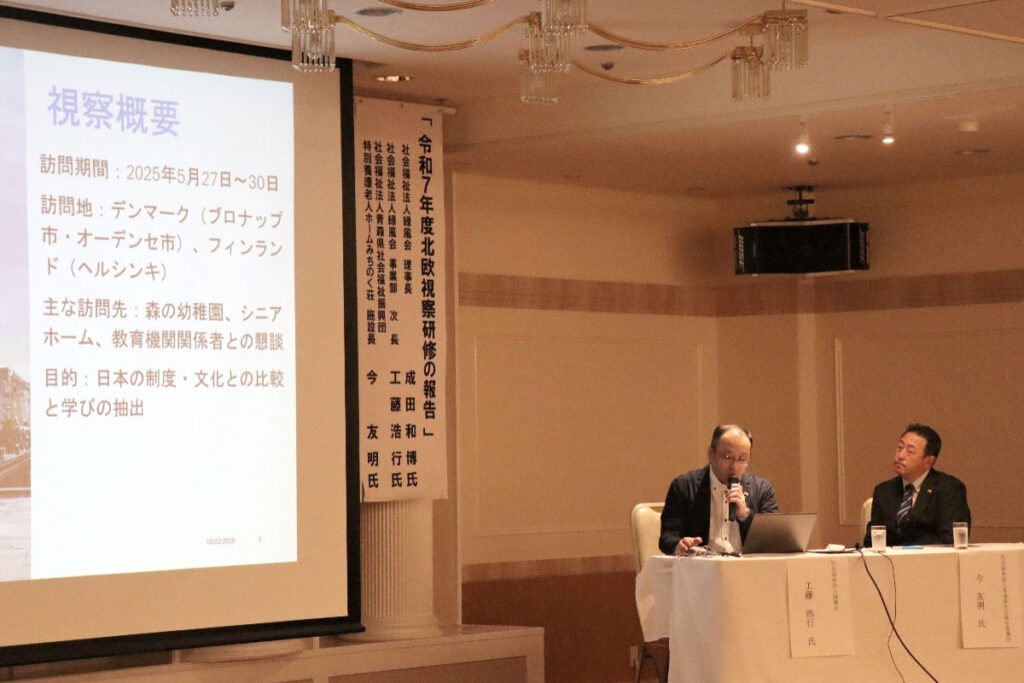 北欧視察報告では、社会福祉法人青森県社会福祉振興団 特別養護老人ホームみちのく荘 今施設長から「北欧に学ぶ高齢者福祉と教育制度」について、社会福祉法人緑風会 事業部 工藤次長から「デンマークの福祉について」ご報告いただきました。